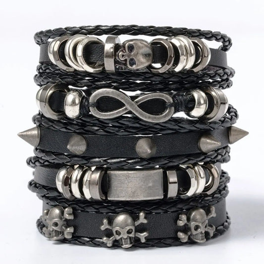 5pcs Metal Diy Braided Punk Style Bracelet Set, Featuring Pu Leather And Beads